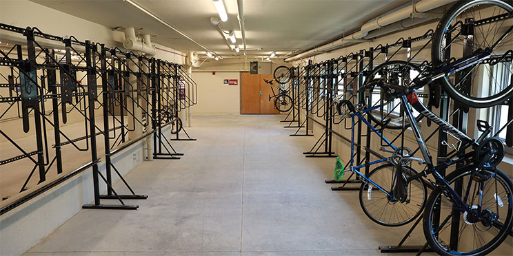 Located on the northeast corner of Ballantine Hall, the hub provides indoor space for over 100 bicycles, and two bike repair stations. The button activated door at the main entrance provides hands free access so users can roll in their bikes. The floor racks are intended for use by those who cannot lift a bike onto the wall racks and bikes that do not fit on the wall racks like cargo and recumbent bikes.